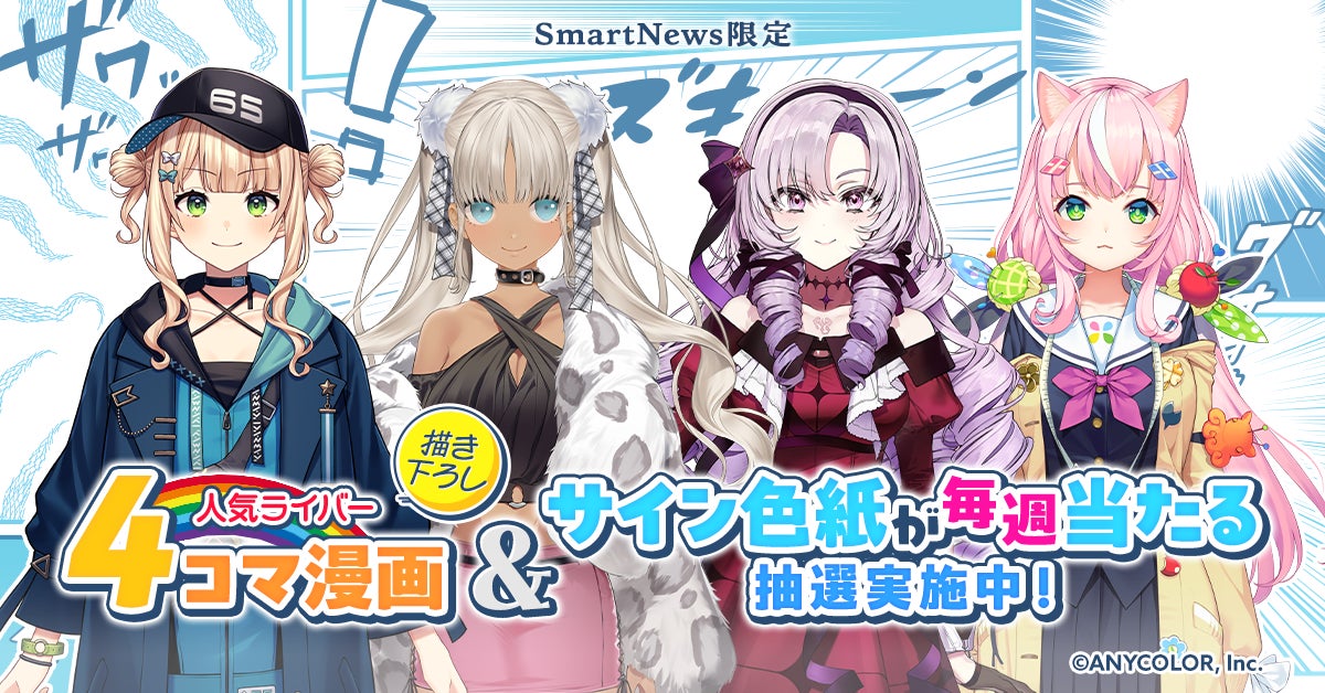 SmartNewsの「にじさんじチャンネル」限定で、人気ライバー4名が描き下ろした4コマ漫画を毎週水曜日と土曜日に更新。また開催期間中、毎週抽選で当たるサイン色紙プレゼントキャンペーンを実施。