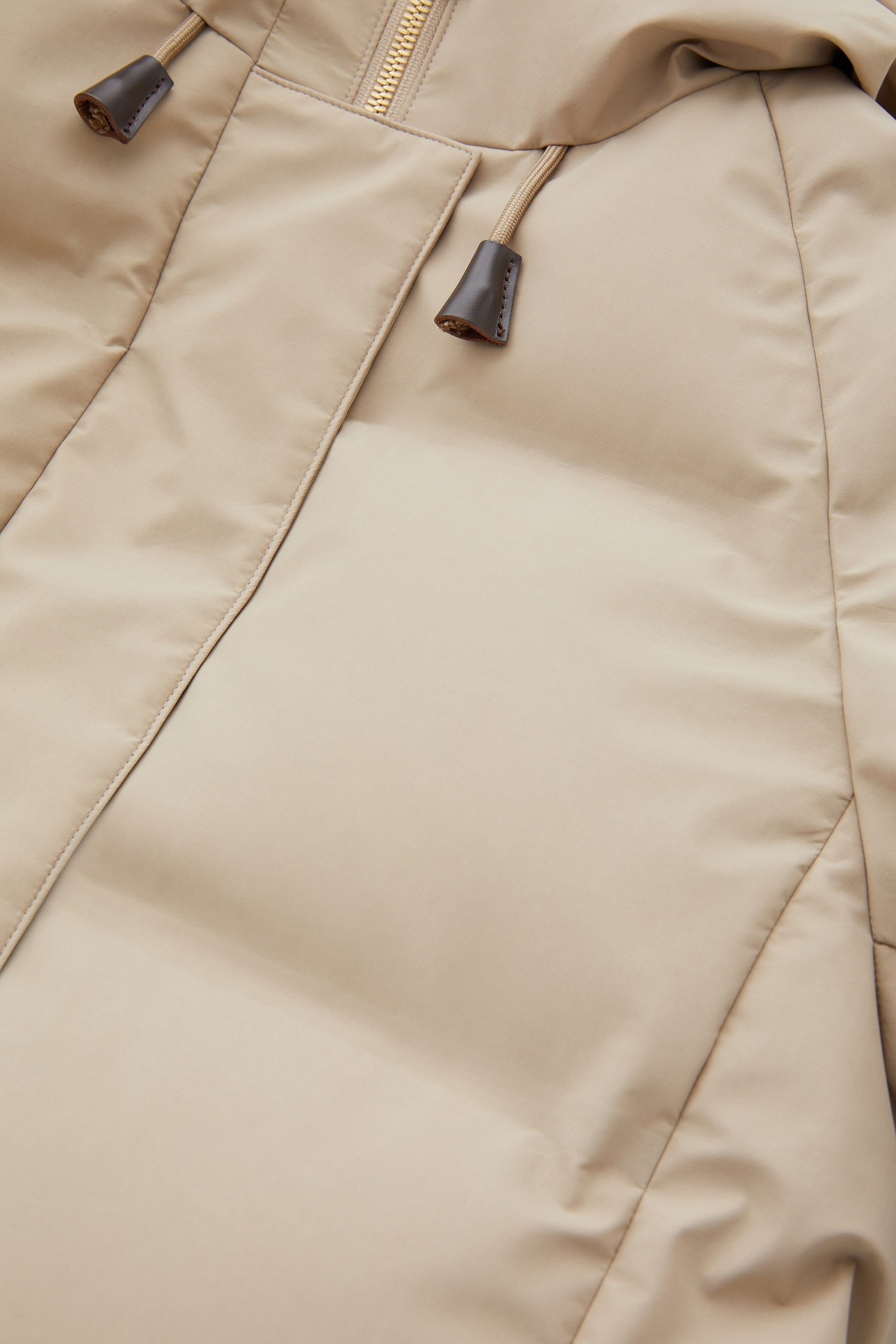 デザインは、ジャケットの上から羽織っても美しい着丈、シルエットを追求し、ダウンパックの段数やダウンの量も試行錯誤を重ね上品に仕上げています。「熱圧着」の無縫製技術を駆使することで縫い目を極力減らしたことも上品な雰囲気を出す上でポイントになっています。悪天候の日はフード部分のストラップによりフードの形を調整して着用することができます。カジュアルなスタイルだけでなく、上品な装いにも合わせやすく、雨や雪の日など幅広く活用できるダウンコートです。