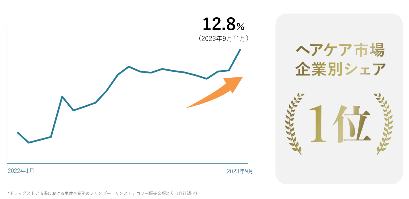 2023年9月におきましても、当社が運営するヘアケアブランドの合計販売金額が、ドラッグストア市場における単体企業別で、メーカーシェア日本1位*となりました。