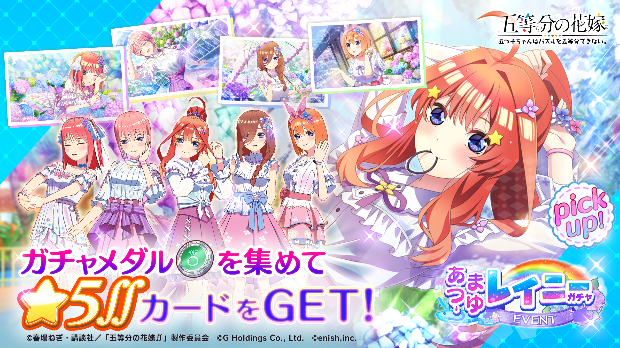 株式会社enish(本社:東京都港区、代表取締役社長:安徳 孝平、以下enish)は、2022年6月3日(金)より、アニメ「五等分の花嫁」初となるゲームアプリ『五等分の花嫁 五つ子ちゃんはパズルを五等分できない。』にて、週刊少年マガジン編集部完全監修のゲームオリジナルストーリーをフルボイスでお楽しみいただける新イベント「五つ子ちゃんとあまつゆの中で ~雨に濡れてはいけません!~」を開催いたします。