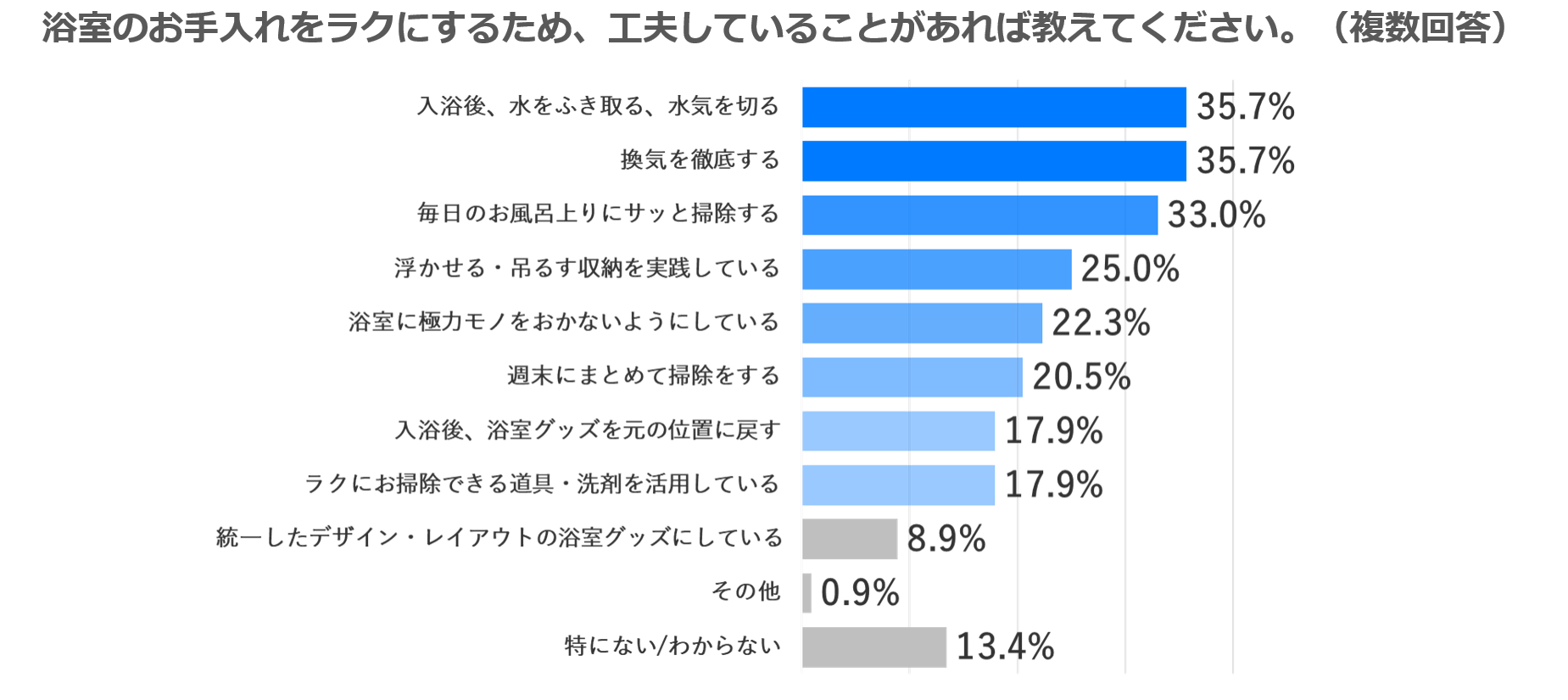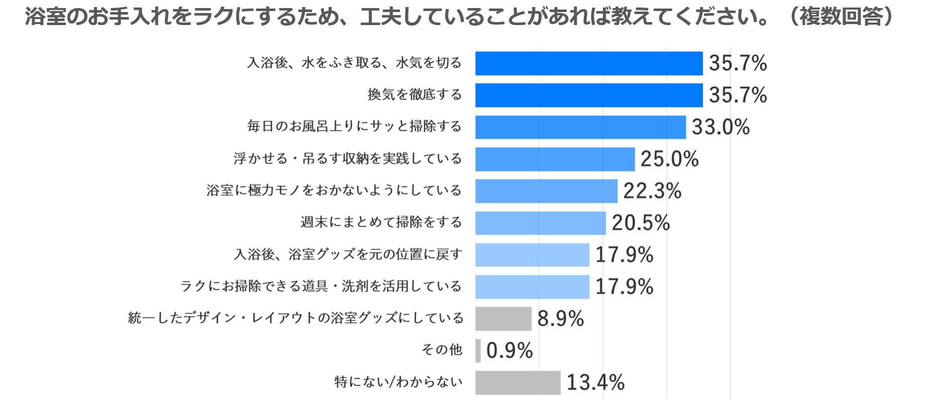 次に、浴室のお手入れをラクにするための工夫を尋ねたところ、「入浴後、水をふき取る、水気を切る」(35.7%)「換気を徹底する」(35.7%)が最も多く、次いで「毎日のお風呂上りにサッと掃除する」(33.0%)となりました。毎日少しずつ手入れを行うことで、カビや汚れの蓄積を防いでいるようです。また一方で、第4位には「浮かせる・吊るす収納を実践している」(25.0%)と収納によって水気を切る工夫も見受けられました。