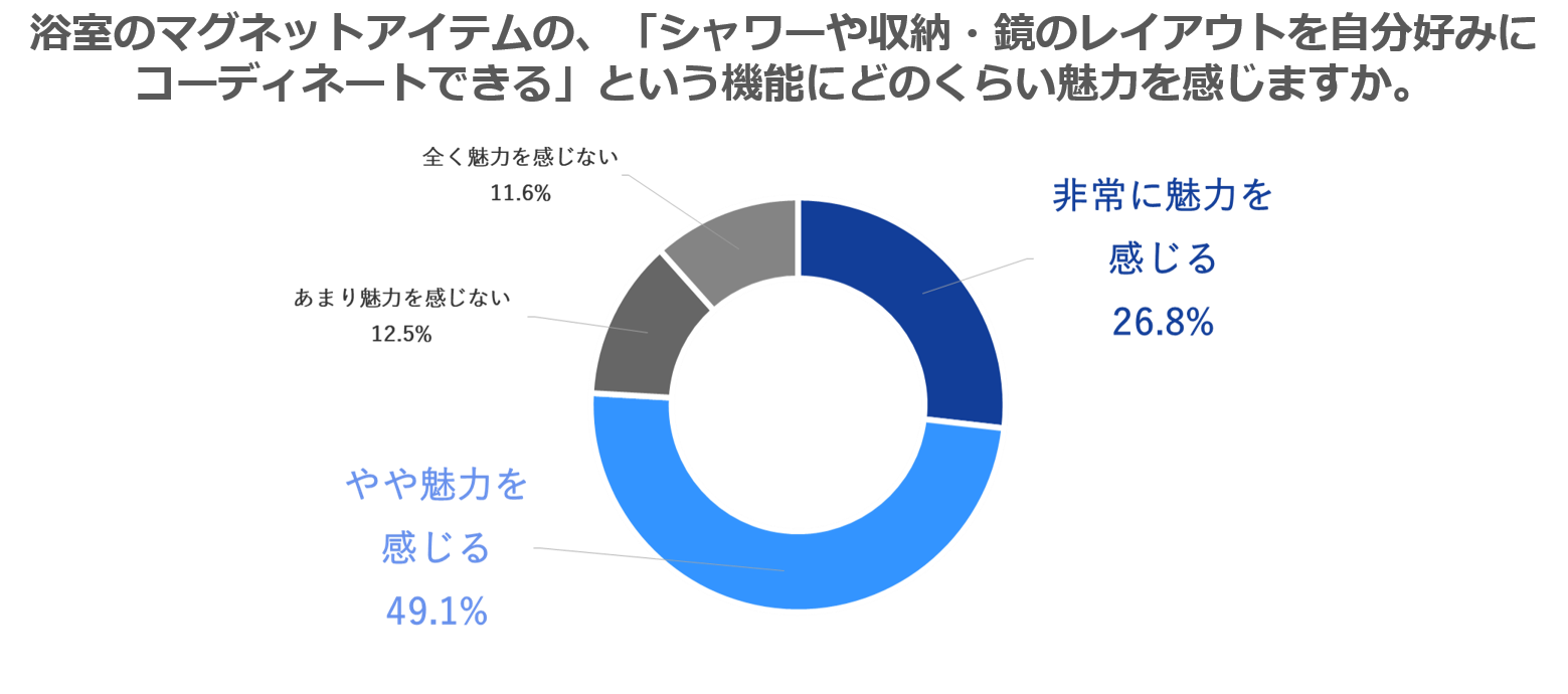 次に、「シャワーや収納・鏡の位置が、自分の高さに合っておらず、不便を感じたことがあるか?」の質問に対しては、4割以上の方が「ある」(42.0%)と回答。そのため、浴室マグネットアイテムの「シャワーや収納・鏡の位置を自分に合った高さに簡単に変更できる」という機能については、「75.0%」が「魅力を感じる」と回答しました。加えて、「シャワーや収納・鏡のレイアウトを自分好みにコーディネートできる」という機能に対しても、75.9%の方が「魅力を感じる」と回答しました。自分にあった高さ・位置に調整できる「使いやすさ」や、各ご家庭での収納量や入浴スタイルに応じて、適切にレイアウトできる点が好感のポイントかもしれません。