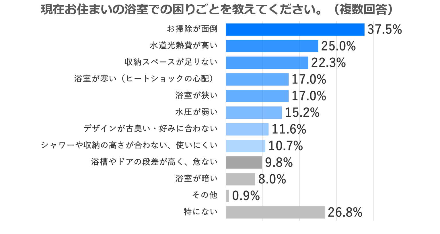 現在お住まいの浴室でのお困りごとを質問したところ、「お掃除が面倒」が最も多く(37.5%)、次いで「水道光熱費が高い」(25.0%)、「収納スペースが足りない」(22.3%)という回答となりました。