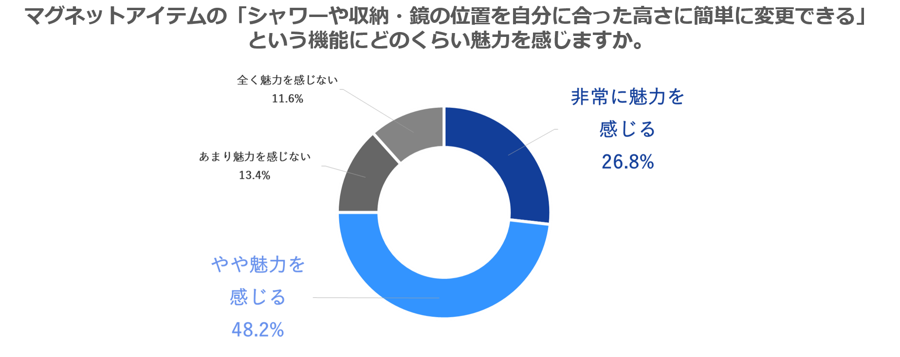 ■シャワーの位置が自分の高さにあっていない、4割以上。マグネットアイテムの「自分に合った高さに変更できる」機能には、75%以上が魅力を感じると回答。
