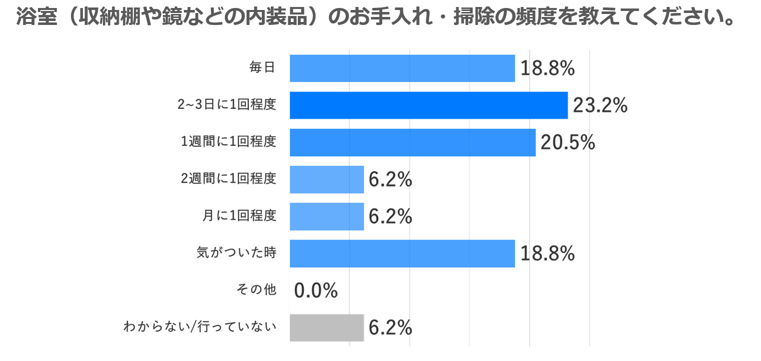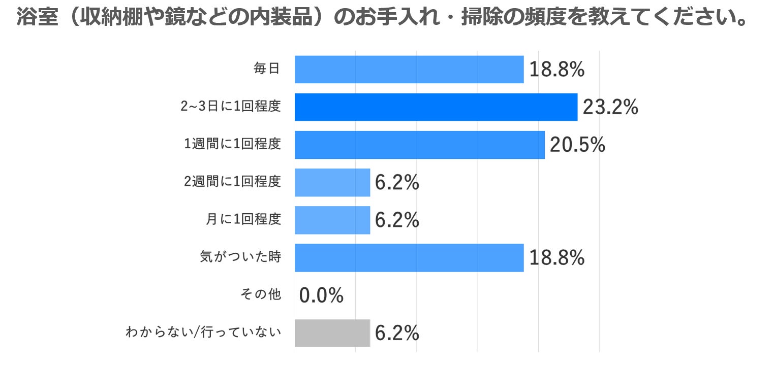 お手入れの頻度は、浴槽まわりは「毎日」、内装品は「2~3日に1回」が最多