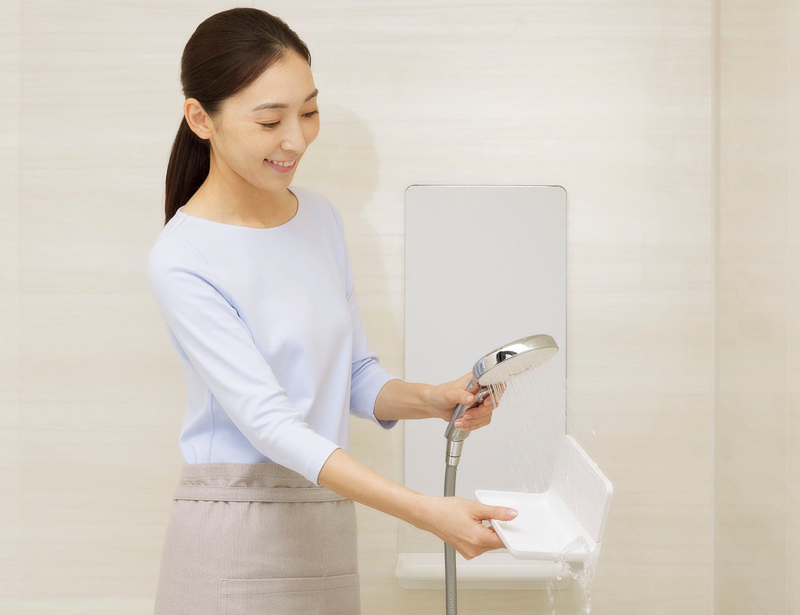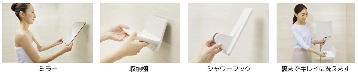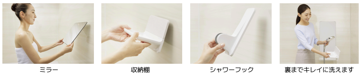 収納棚だけでなく、シャワーフックやミラー、風呂フタフックまで、マグネットアイテムとして、新登場。全て取り外して、まる洗いできるので、お掃除がもっとラクに。お掃除しにくかった収納棚やミラーの隅々まで、ラクな姿勢で洗うことができます。
