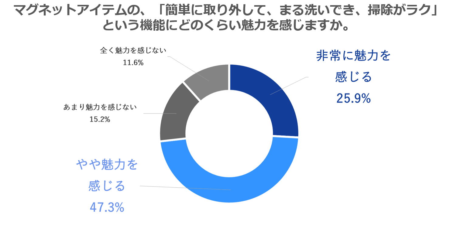 まずは、マグネットアイテムの「簡単に取り外して、まる洗いでき、掃除がラク」という機能について、魅力を感じるか?と尋ねてみたところ、73.2%の方が魅力を感じると回答しました。