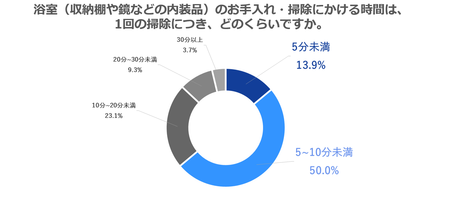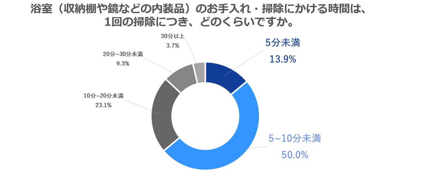 また、浴室のお手入れ・掃除の頻度について、浴槽まわりは「毎日」(32.1%)が最多となり、次いで「2~3日に1回程度」(23.2%)となりました。収納棚や鏡などの内装品は「2~3日に1回程度」(23.2%)、「1週間に1回程度」(20.5%)という結果となり、こまめにお掃除をされている方が多いようです。また、収納棚や鏡などの内装品の掃除にかける時間は、「10分未満」の方が63.9%とスピーディーに仕上げる方が多いことがわかりました。