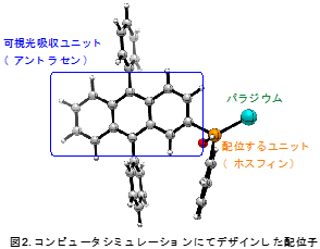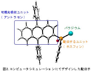予め計算を行うことで分子の様々な物性が予測可能となり、研究開発をスピードアップさせることが可能です。計算の結果、ジフェニルアントラセンと呼ばれる可視光を吸収するユニット及びホスフィン(注3)を組み合わせた配位子が、効率的に可視光のエネルギーをパラジウムに受け渡すと予測されました。
