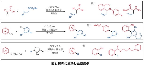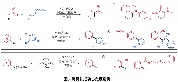 しかし、近年報告され始めたパラジウムに「可視光」を照射する反応で用いられている「配位子」は従来の「熱」をエネルギー源とする方法で開発されたものばかりであり、光による反応のためにデザインされた配位子はほとんどありませんでした。