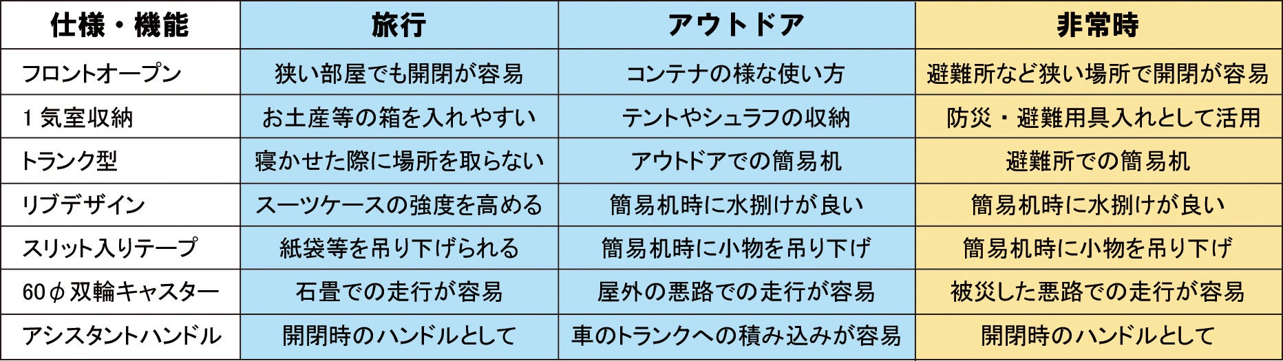 縦長の「トランク型」で、寝かせた際に場所を取らず、非常時は避難所などで簡易机として使用可能。