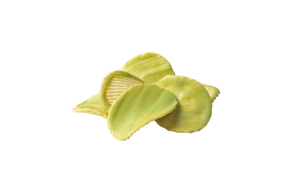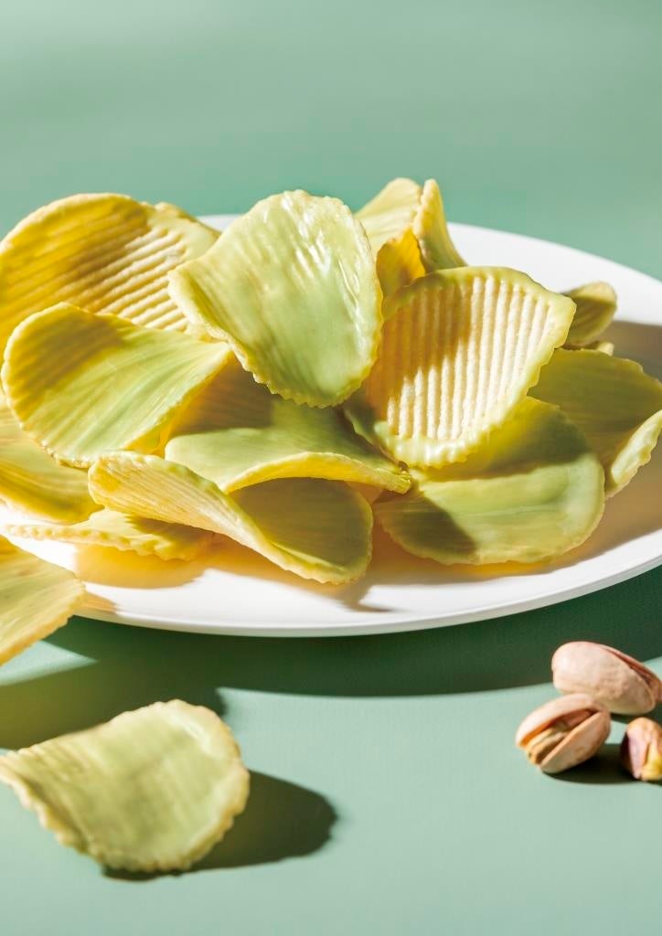 好評をいただいておりますポテトチップスチョコレートですが、今回新たにピスタチオチョコレート味を開発させていただきました。ベルギー産のホワイトチョコレートにピスタチオペーストを配合し、ピスタチオの豊かなナッツ感と芳醇なホワイトチョコレートの味わいをポテトチップスの塩味でまとめました。ピスタチオグリーンの柔らかな色彩も目でお楽しみください。