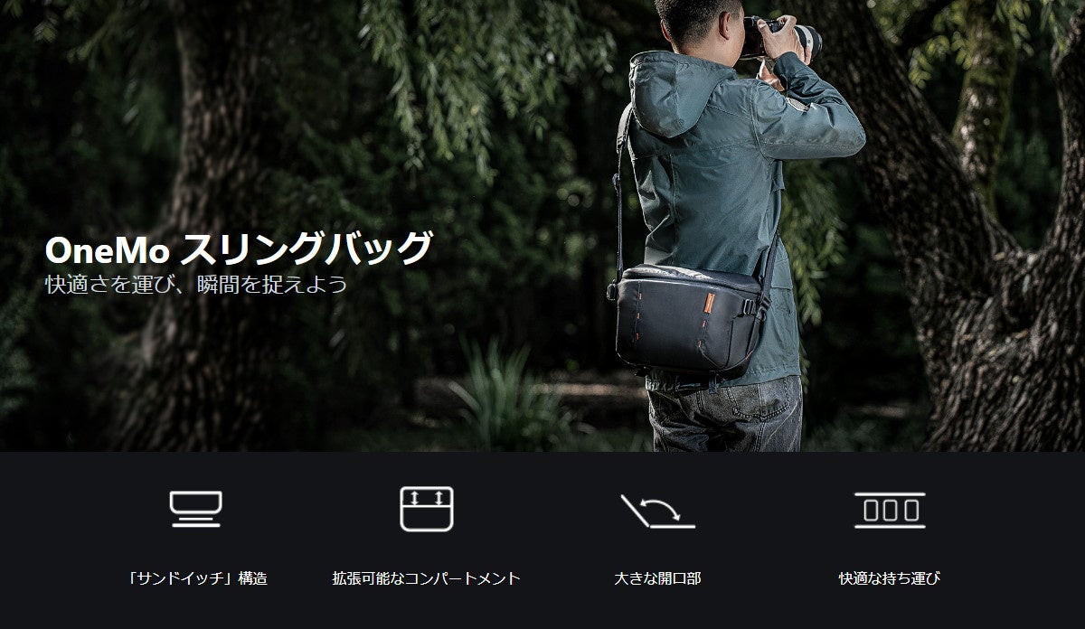 世界中のユーザーに愛用される人気カメラバッグ OneMoシリーズから、初となるスリングバッグが登場。洗練されたデザインと自由にカスタマイズできるパーティションで、直感的にアイテムを取り出すことができる、快適な撮影をサポートするバックが誕生しました。