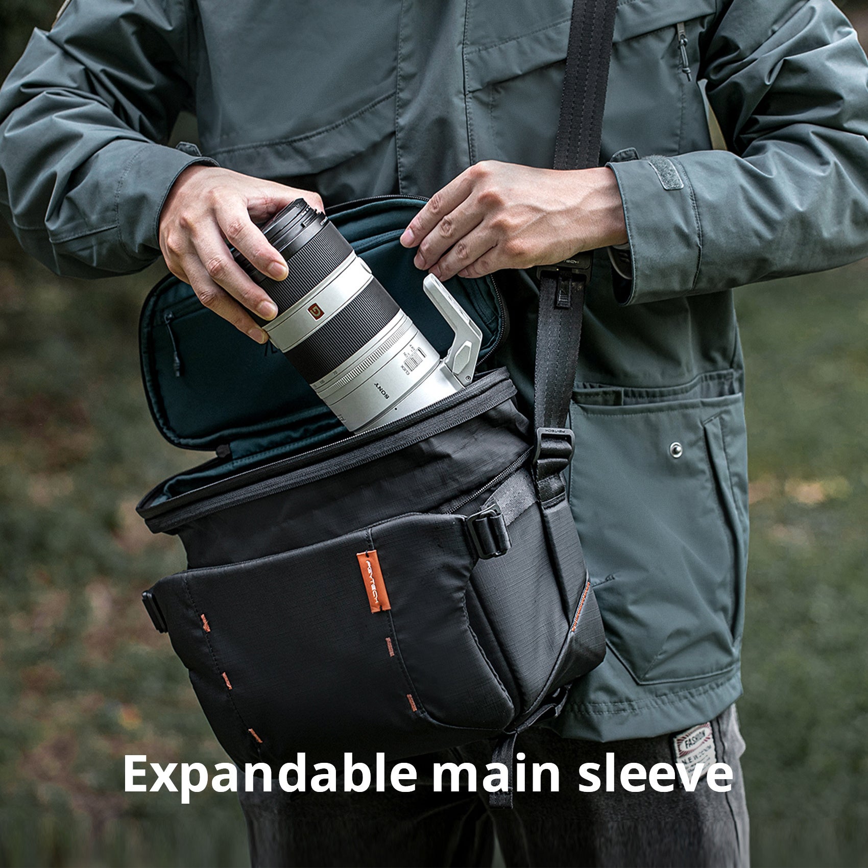 OneMo シリーズの最新製品である OneMo スリングバッグ は、統一感のあるデザインと包括的な機能、洗練された外観を備えています。革新的な「サンドイッチ」構造により、ギアの整理が簡単です。メインスリーブにはカメラを、調節可能なミドルスリーブにはスタビライザーや大きなアイテムの収納に最適です。フロントスリーブには小さな必需品が収納できるほか、500mlのペットボトルも収納できます。さらにトップカバーにはフィルターやバッテリーなどのコンパートメント用のメッシュポケットを備えます。また、拡張可能なメインコンパートメントは最大13.5L(11Lモデル)まで広がり、70-200mmレンズと14インチMacBook Proが収納できます。上部の大きな開口部から必要な機材に簡単にアクセスでき、下部のストラップには三脚の取り付けが可能です。快適さのために厚みと幅を広げたショルダーパッドが組み込まれ、素早い調整に対応したショルダーストラップには、カメラクリップやカラビナが取り付けでき、様々なシーンや被写体に対応して快適な撮影をサポートします。