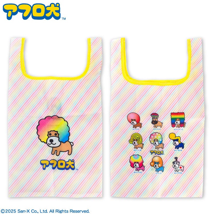 コンパクトに折り畳めるエコバッグは、「リーゼン犬」や「カーリー犬」などアフロ犬フレンズが集結したデザインです。
