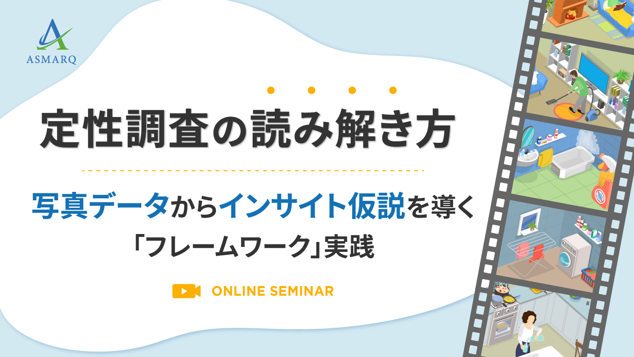 株式会社アスマーク(東京都渋谷区東、代表取締役:町田正一)は、2026年2月19日(木)13:00に、「定性調査の読み解き方」をテーマに、写真データから具体的なコンセプトの種(インサイト仮説)を導くためのフレームワークを、事例を交えながら解説するセミナーをご案内いたします。