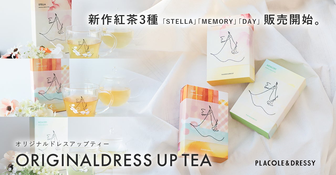 『個性が煌めく魔法の言葉』 "100人の人生に100通りに煌めく魔法をかける"をテーマに創設された古都鎌倉発のラグジュアリーブランド、PLACOLE&DRESSY(プラコレ&ドレシー)がプロデュースするカフェ&バー、『お花とドレスと紅茶のお店 DRESSY ROOM&Tea』と名古屋駅直結KITTE名古屋3Fウェディングのテーマパークカフェ『DRESSY CAFE -きらめく魔法にかかる空間-』の2店舗と専用ECサイト『DRESSYONLINE』にて販売しているオリジナルブレンドティーと農薬不使用のエディブルフラワー(食用花)のセットに新作紅茶「STELLA(ステラ)』『DAY(デイ)』『MEMORY(メモリー)』が仲間入り!1から独自で調合したオリジナルブレンドは、香り高く、華やかなカラーが特徴的です。 それぞれのフレーバーに込められたメッセージと、色鮮やかな花のパッケージは、特別な瞬間を彩るためのギフトにもぴったり。 是非おうちで、PLACOLE&DRESSYがつくる自慢の紅茶をお楽しみください。