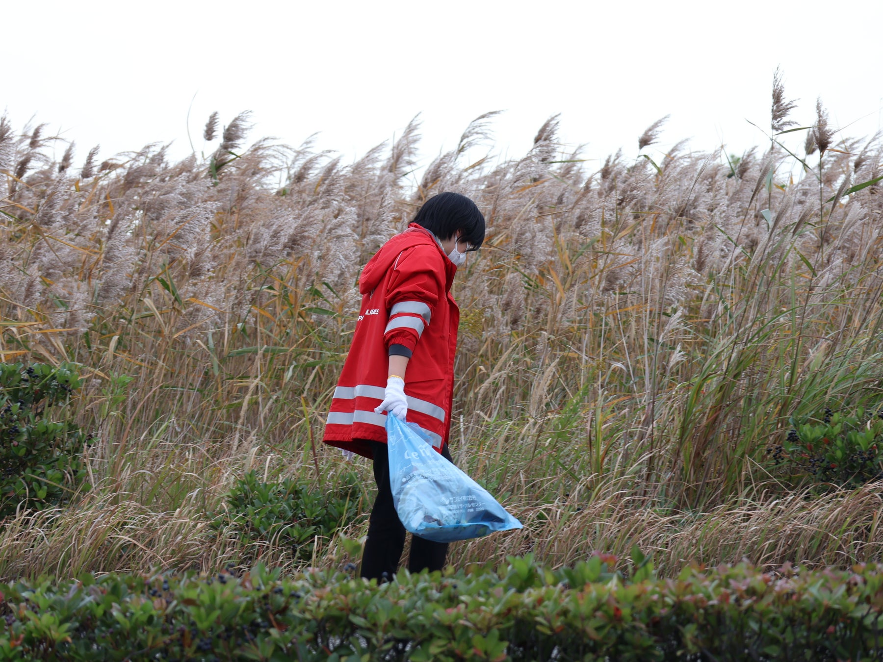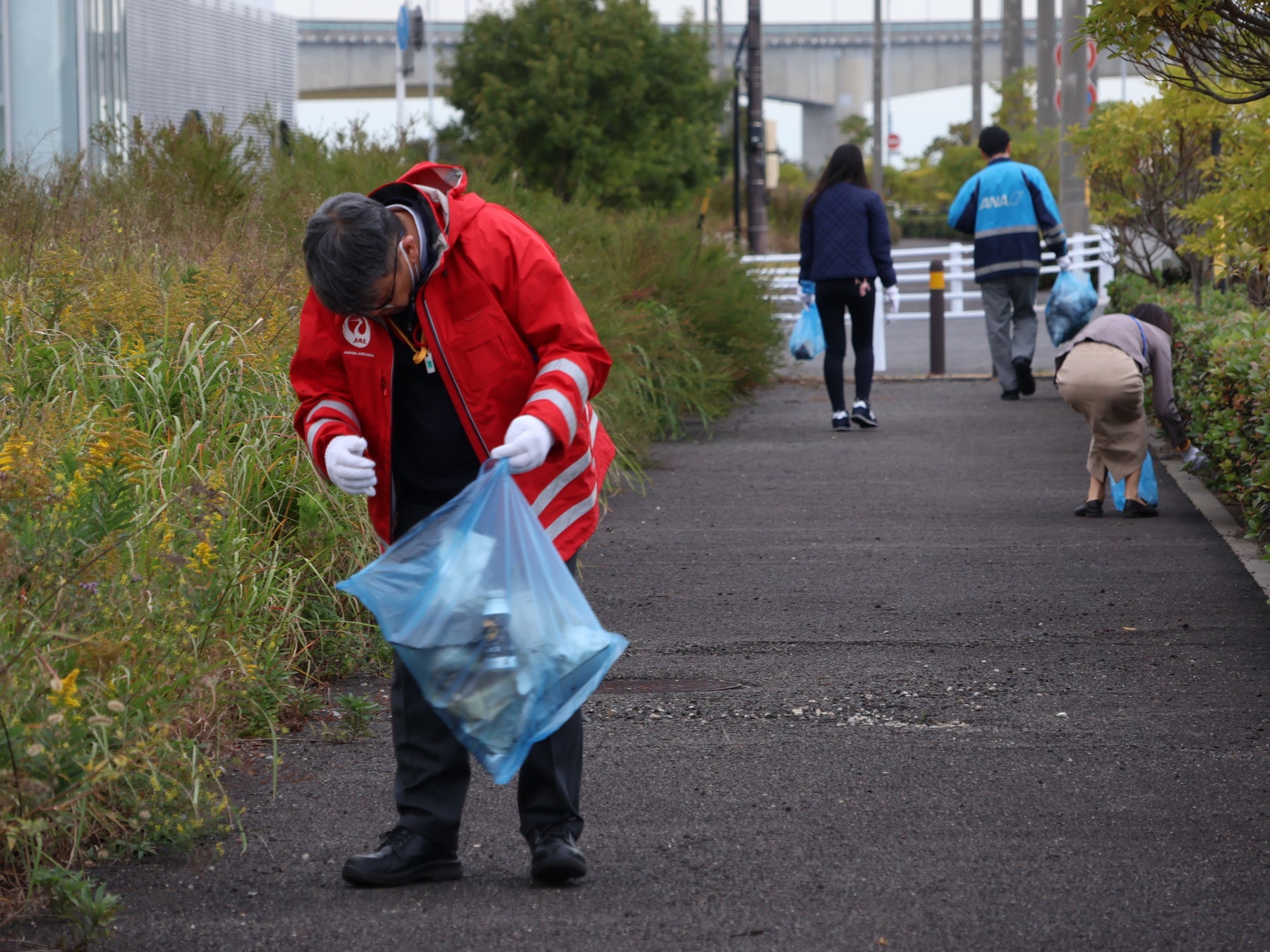 今回の清掃エリアは、滑走路や旅客ターミナルから最も離れた空港東側の海沿いエリア。普段は業務でも立ち入る機会も少なく、人の往来もほとんどない自然豊かな場所です。参加者は、そんな静かな一角にもペットボトルやビニール袋などのごみが散見され、景観を損ねていることに驚きながら、腰をかがめたり背伸びをしたりして、熱心に清掃活動に取り組んでいました。