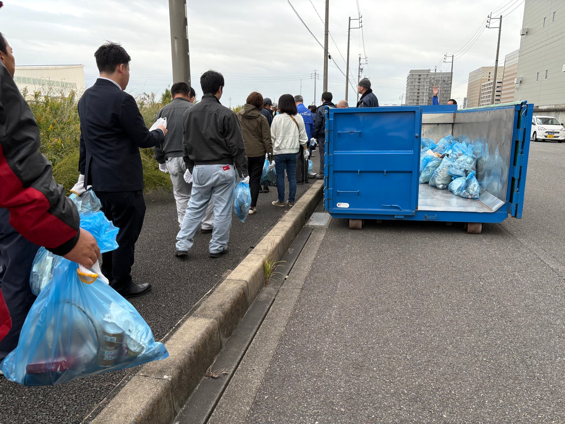40分間の制限時間が終了すると、参加者は再集合し、集めたごみはひとつづつ計量されました。総重量は約100キロに到達。用意されたごみ用コンテナはみるみるうちに満杯になりました。 集計を待つ間には、参加者同士が成果を見比べながら、ペットボトルやカーテン、壊れたバッグなど、予想以上に多様なごみの種類に驚きの声を上げていました。