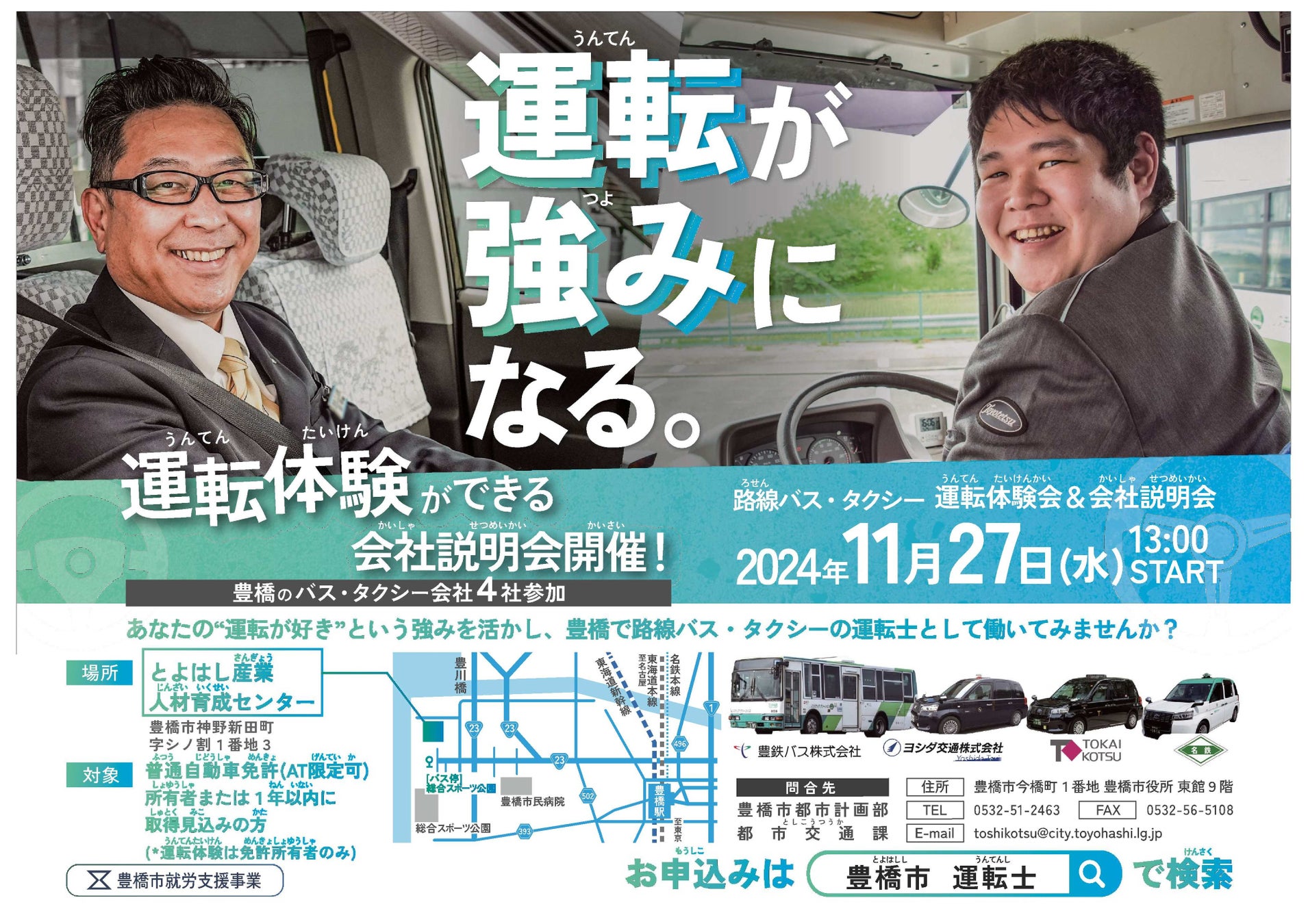 2024年11月27日(水)にとよはし産業人材育成センターで行う「路線バス・タクシー運転体験会&会社説明会」では、豊鉄バス(株)、豊鉄タクシー(株)、 東海交通(株)、ヨシダ交通(株) の4社から話が聞けます。さらに、教習コースを使って実際の路線バス・タクシーを運転できる体験会も企画しています。春募集参加者からは、「運転士として働くイメージが持てた」「体験してさらに興味がわいた」などと好評でした。また、当日は、キャリアコンサルタントによる就職支援セミナーや、市役所による事業説明会も行います。