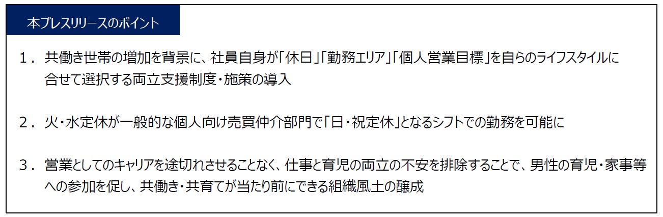 売買仲介部門の社員を中心に、「日曜日・祝日に対応可能な保育所が限られている」「保育所からの突発的な呼び出しに対応しやすいエリアで働きたい」「育児休業明けすぐに休業前と同じ営業目標を達成するのは負担が大きい」などの声が増えてきており、社員自身がライフスタイルに応じた働き方を選択する環境づくりが求められております。