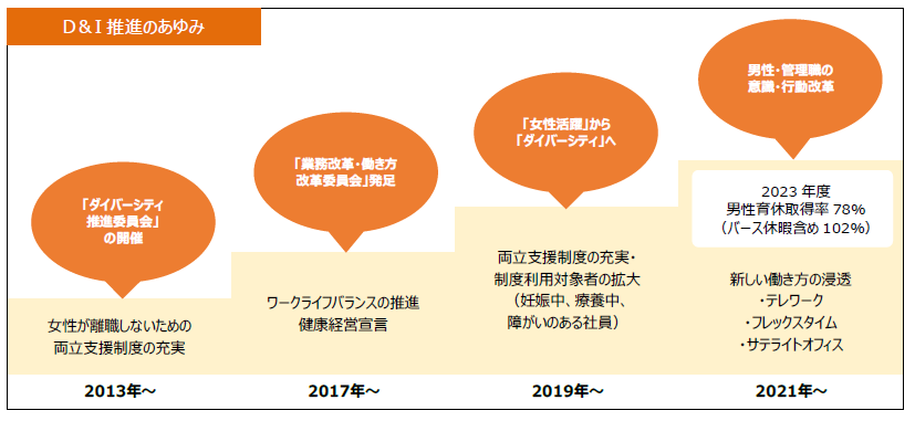 今後も当社は、さまざまな属性において多様性を持つことを前提に、互いの違いを尊重しあい、すべての従業員が自分は受け入れられていると感じることができる企業文化を醸成することで、多種多様な組織・人びとと共に手をとりあって挑戦し続け、新たな価値を創造してまいります。