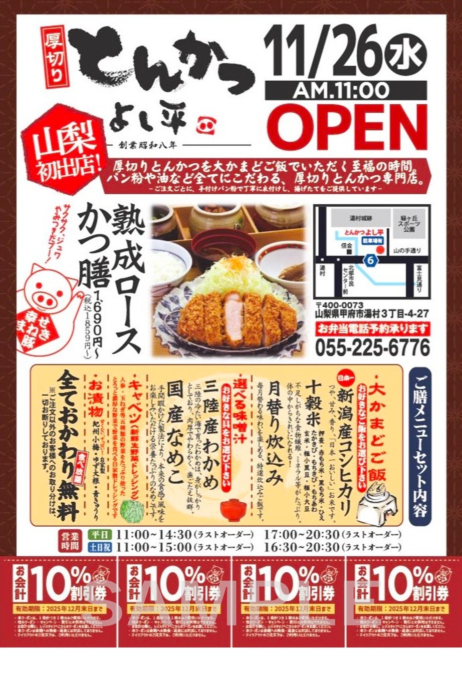 【山梨 “初”上陸!】『厚切りとんかつ よし平』が、甲府市湯村に11/26(水)オープン!