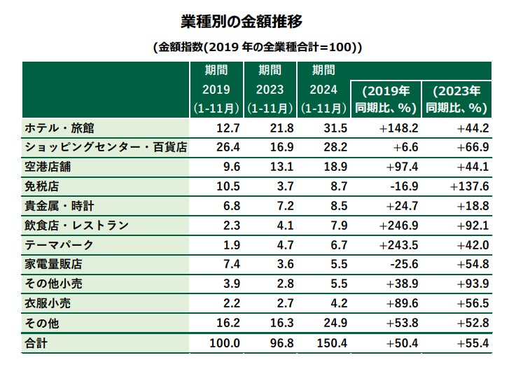 2019年1-11月と比較し、決済業種別ではホテル・旅館、飲食店・レストラン、テーマパークといったコト消費が好調となりました。空港店舗も同期比で97.4%増と大きく成長しました。また、前年同期比では免税店の成長率が137.6%増と高くなっています。好調なインバウンド消費を背景として、日本国内の免税店の数自体も2023年から2024年にかけて増加しており、決済額が増加したと見られます。