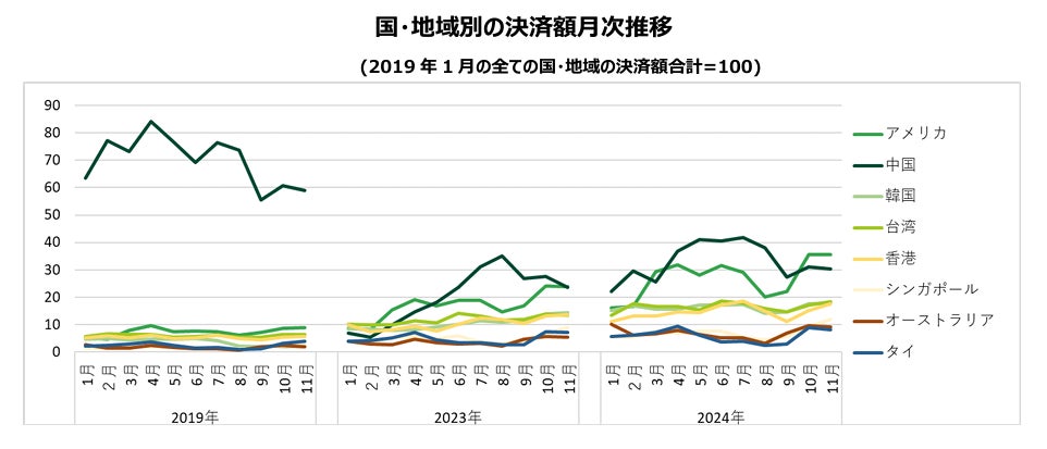 決済額が上位の国・地域の金額推移を月別にみると、中国はコロナ禍前から規模が落ちているものの、2023年以降緩やかに回復しています。アメリカは2019年と比較して2023年に金額規模が大きく成長し、2024年も引き続きプラス成長となりました。特に紅葉シーズンの10月、11月には訪日客数が増加し、決済額は中国を抜き1位となりました。
