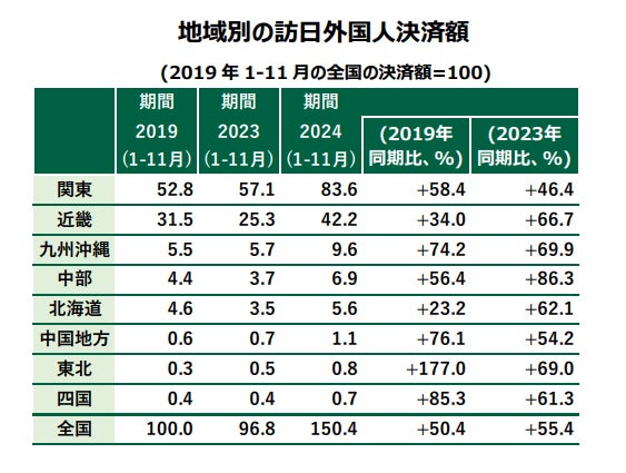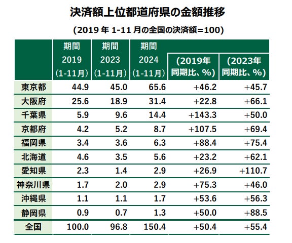 訪日外国人による決済額は、新型コロナウイルスの5類移行や、円安による追い風を背景として2023年に大きく回復し、同年1-11月は、コロナ禍前の2019年に近い水準となりました。2024年も訪日外国人の決済額は成長基調で推移し、2024年1-11月の決済金額は2019年同期比で50.4%増の水準に達しました。また、前年の2023年同期と比較しても55.3%増の水準となり、2024年のインバウンド消費の好調さが伺えます。