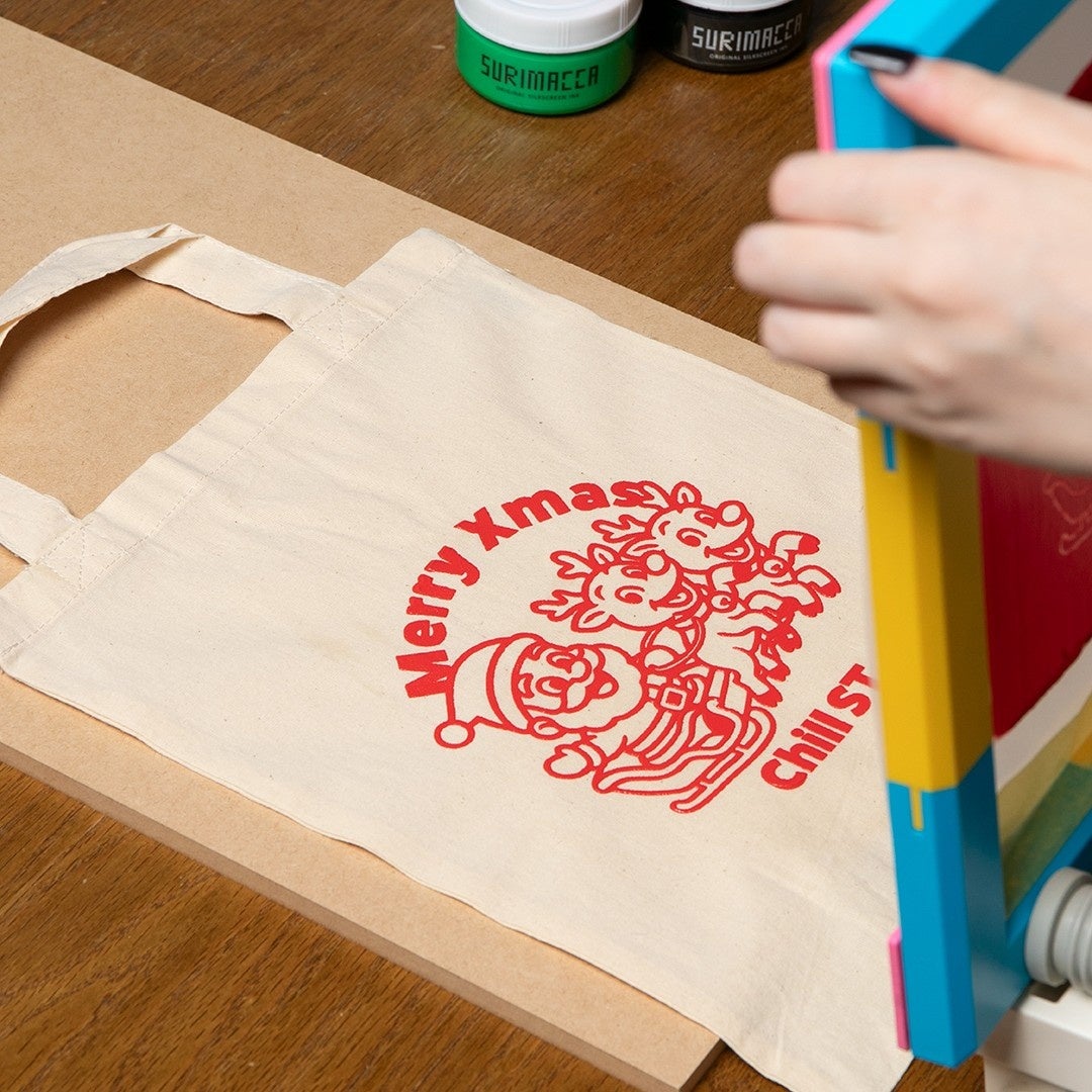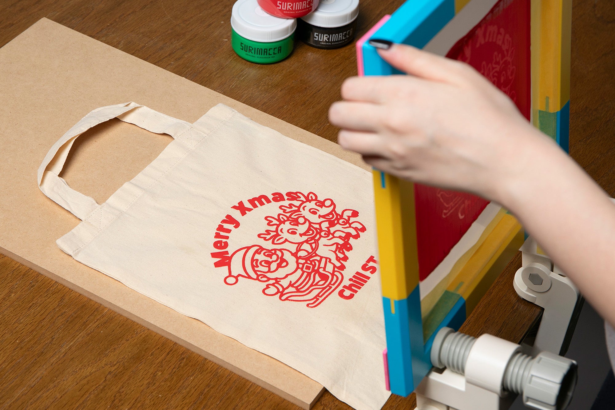 内容:Chill STで商品を購入してくださった方を対象に、Chill STオリジナルシルクスクリーン体験を開催。無地のA4トートバックに自分で場所とデザインを選び印字し、オリジナルのバッグを作成していただけます。