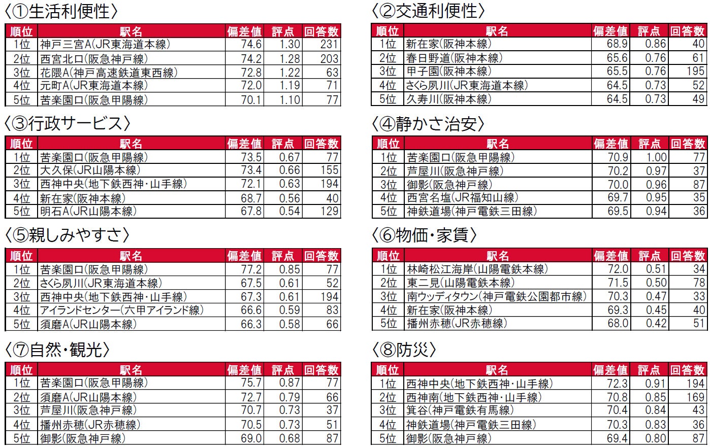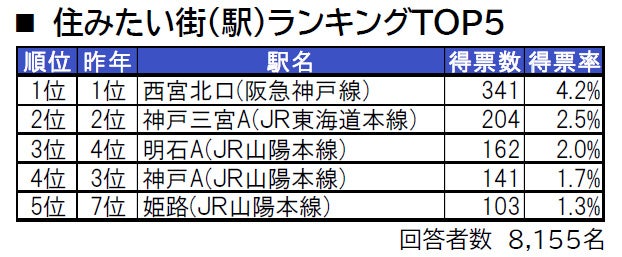 1位は4年連続で西宮北口、2位も4年連続で神戸三宮Aで、安定した人気を得ています。5位には姫路がランクインしており、3位~5位はいずれもJR山陽本線沿線の駅が選ばれています。