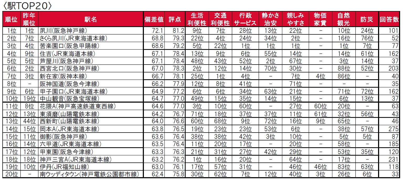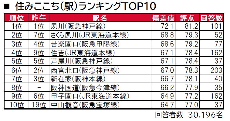 1位は4年連続で関西屈指のお屋敷町の夙川で、唯一偏差値70台で安定した高い評価を得ています。2位はさくら夙川(昨年7位)、3位は苦楽園口(昨年4位)で、トップ3はいずれも西宮市にある駅という結果になっています。トップ10内では、昨年は回答者数が30名未満だったため集計対象外だった阪神国道が8位にランクインしています。
