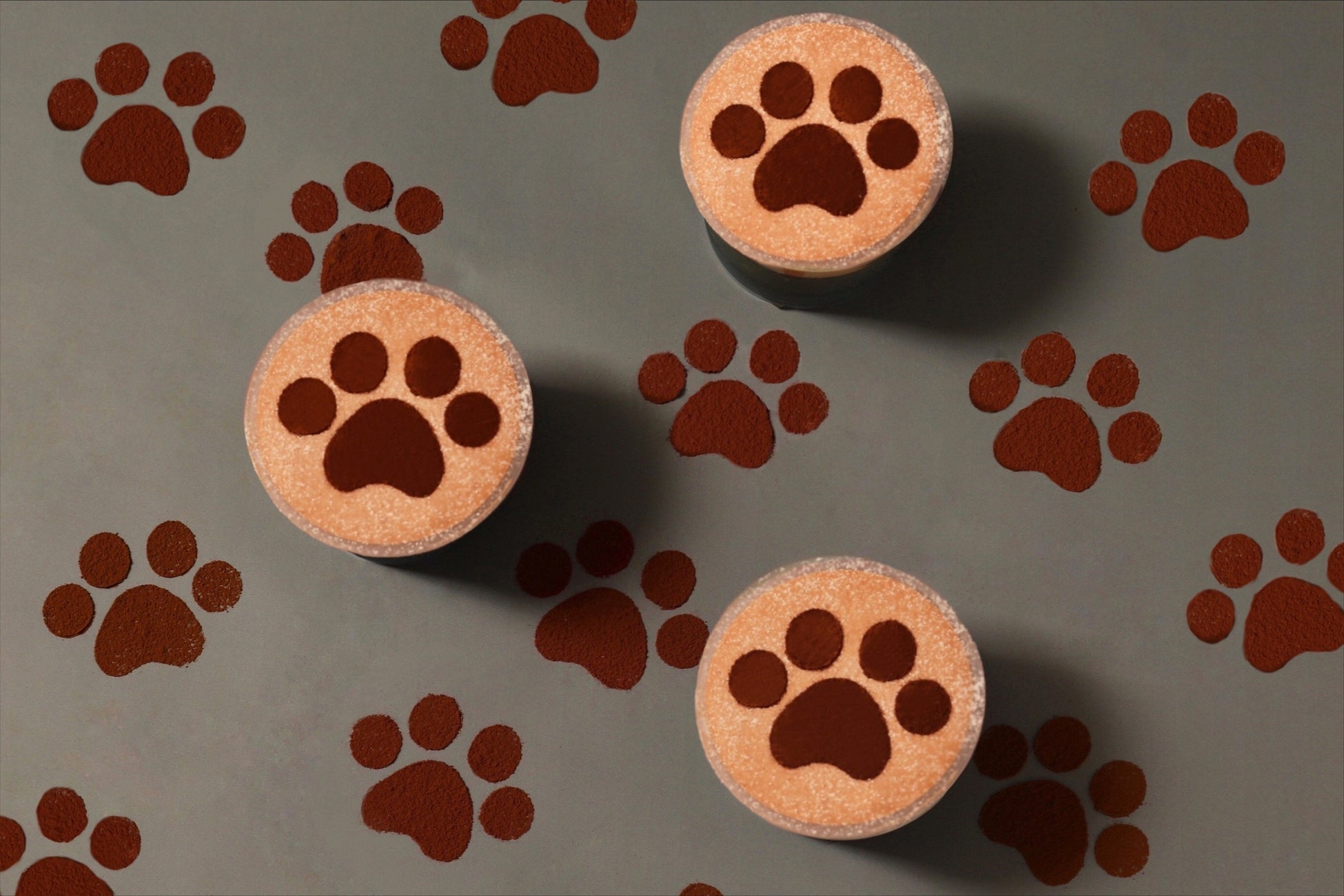 プリンの上にはチョコのホイップクリームを重ねココアパウダーで猫の肉球を描きました。