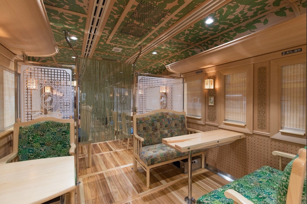 緑色。列車名は球磨川に生息する鳥の名前から名付けられました。内装は、床に人吉球磨産の杉材が使われ、カウンターやテーブルには槍、暖簾は八代産のいぐさなど、自然の温もりにあふれた癒しの空間となっています。