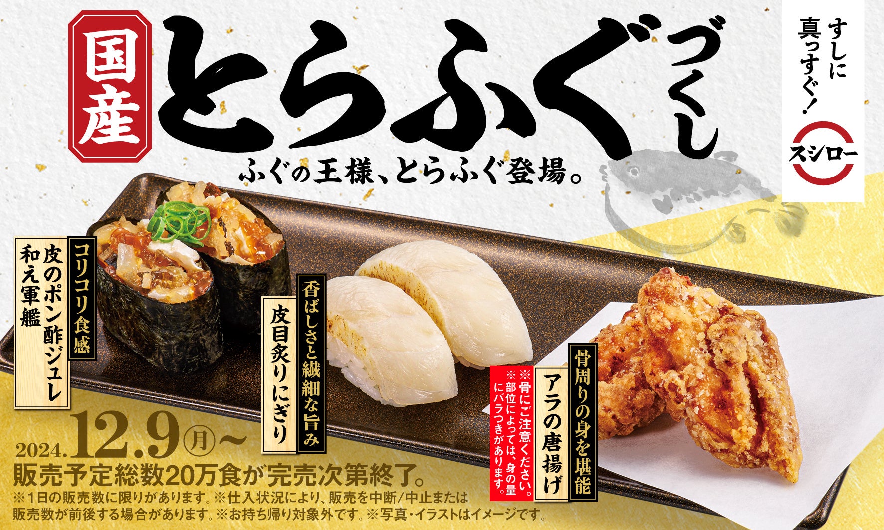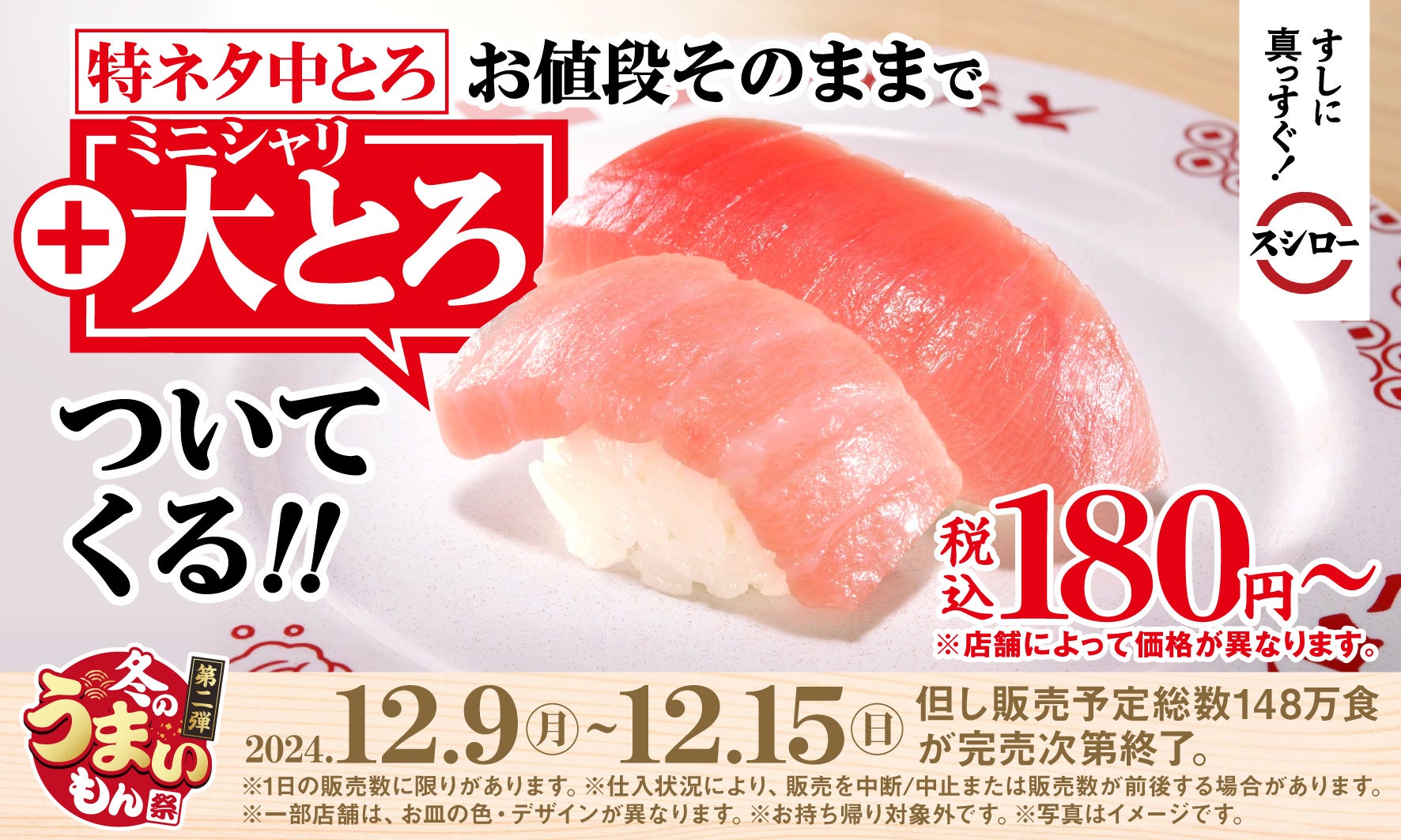 ぜひこの機会に、ミニシャリの大とろがついてくる中とろと、国産とらふぐの食べ比べを楽しめる冬のうまいもん祭 第二弾』を全国のスシローでお楽しみください。