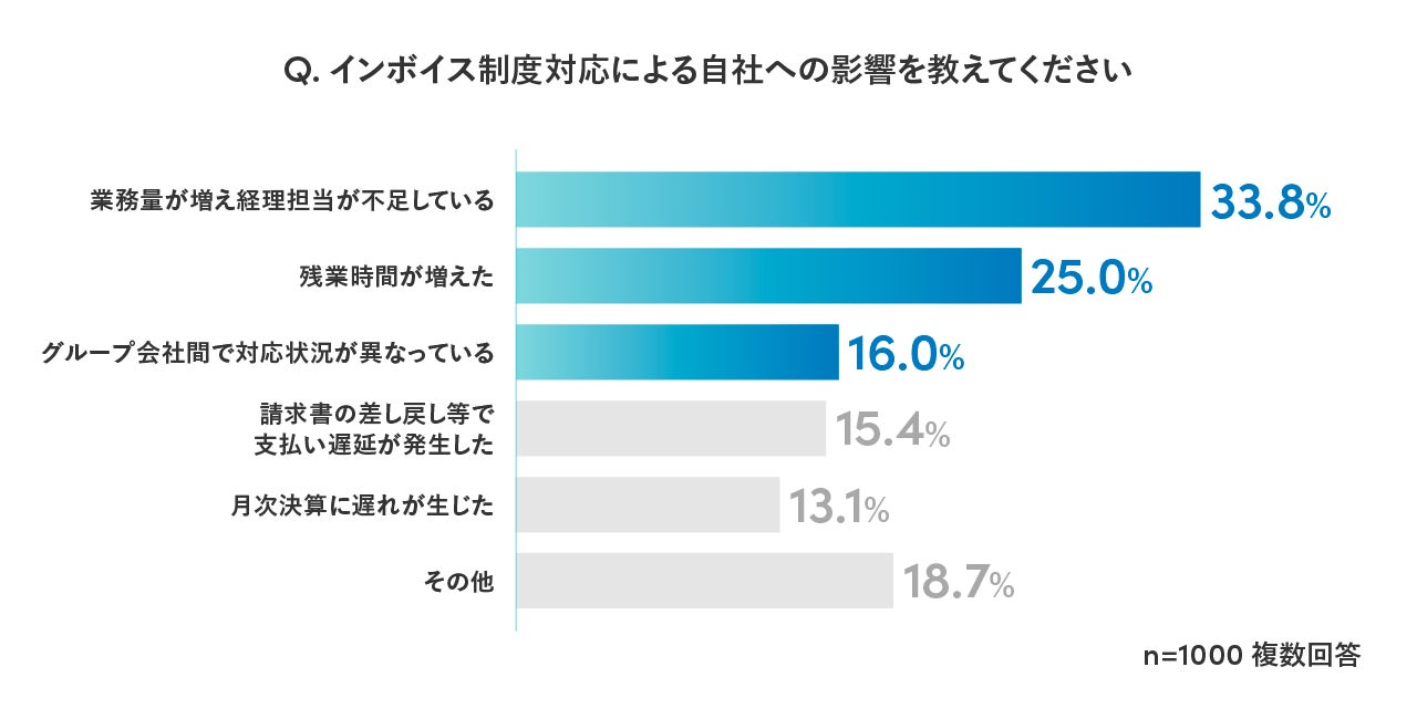 ・インボイス制度による自社への影響で特に大きいのは「経理担当者の不足」「残業時間の増加」「グループ会社間における対応状況の相違」