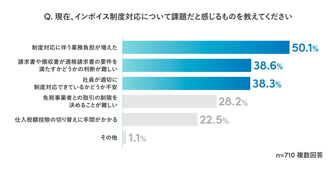 次に「課題を感じている」と回答した人に対し、具体的な課題を聞いたところ、「制度対応に伴う業務負担が増えた」(50.1%)が最も多く、次いで「請求書や領収書が適格請求書の要件を満たすかどうかの判断が難しい」(38.6%)、「社員が適切に制度対応できているかどうか不安」(38.3%)となりました。
