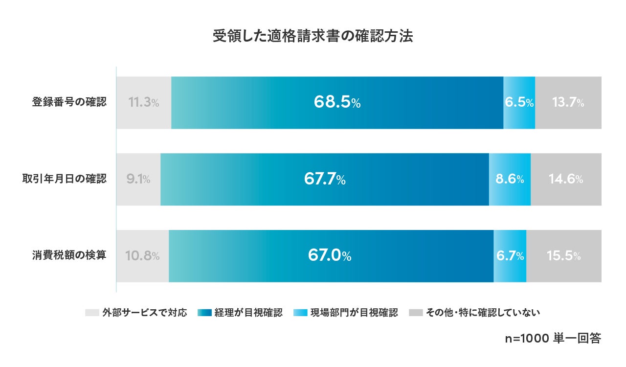 受け取った請求書について、主にどのような方法で適格請求書の要件を確認しているか聞いたところ、約7割の経理担当者が目視確認を行っていることが分かりました。また、現場部門が目視確認しているケースもあり、いまだアナログな確認業務により手間がかかっていることがうかがえる結果となりました。