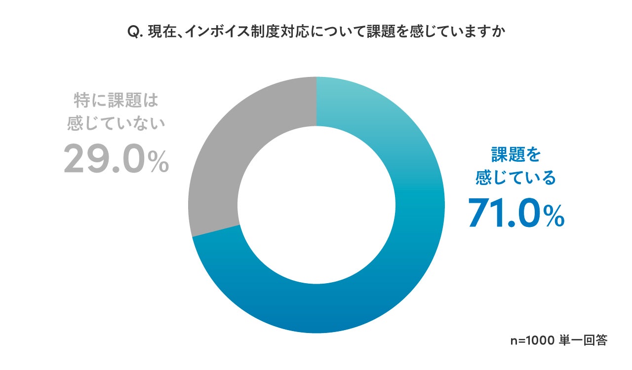 経理担当者1000名に対し、現在インボイス制度対応について課題を感じているか聞いたところ、71.0%が「課題を感じている」と回答し、1年が経過するも制度に対して課題を感じている人が多いことが分かりました。