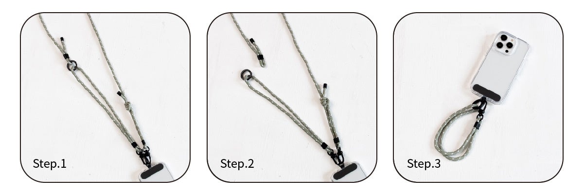 カラビナ部分で長い方と短い方を分け、ハンドストラップにもなる2WAY仕様!