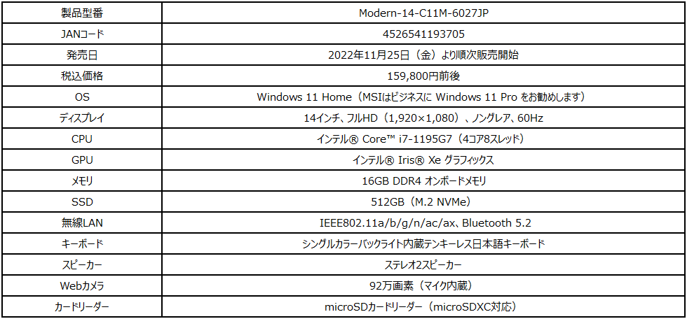 この度、エムエスアイコンピュータージャパン株式会社は、ハイブリッドワーク向けからご家庭向けまで幅広い用途で高速・快適動作できる性能に加え、お買い上げいただいたその日から文書作成やメールなどが使えるオフィスソフトが付属し、3年間の長期保証が付帯したエディオン限定モデルの薄型・軽量ビジネスノートPC「Modern-14-C11M-6027JP」を2022年11月25日(金)より発売いたします。