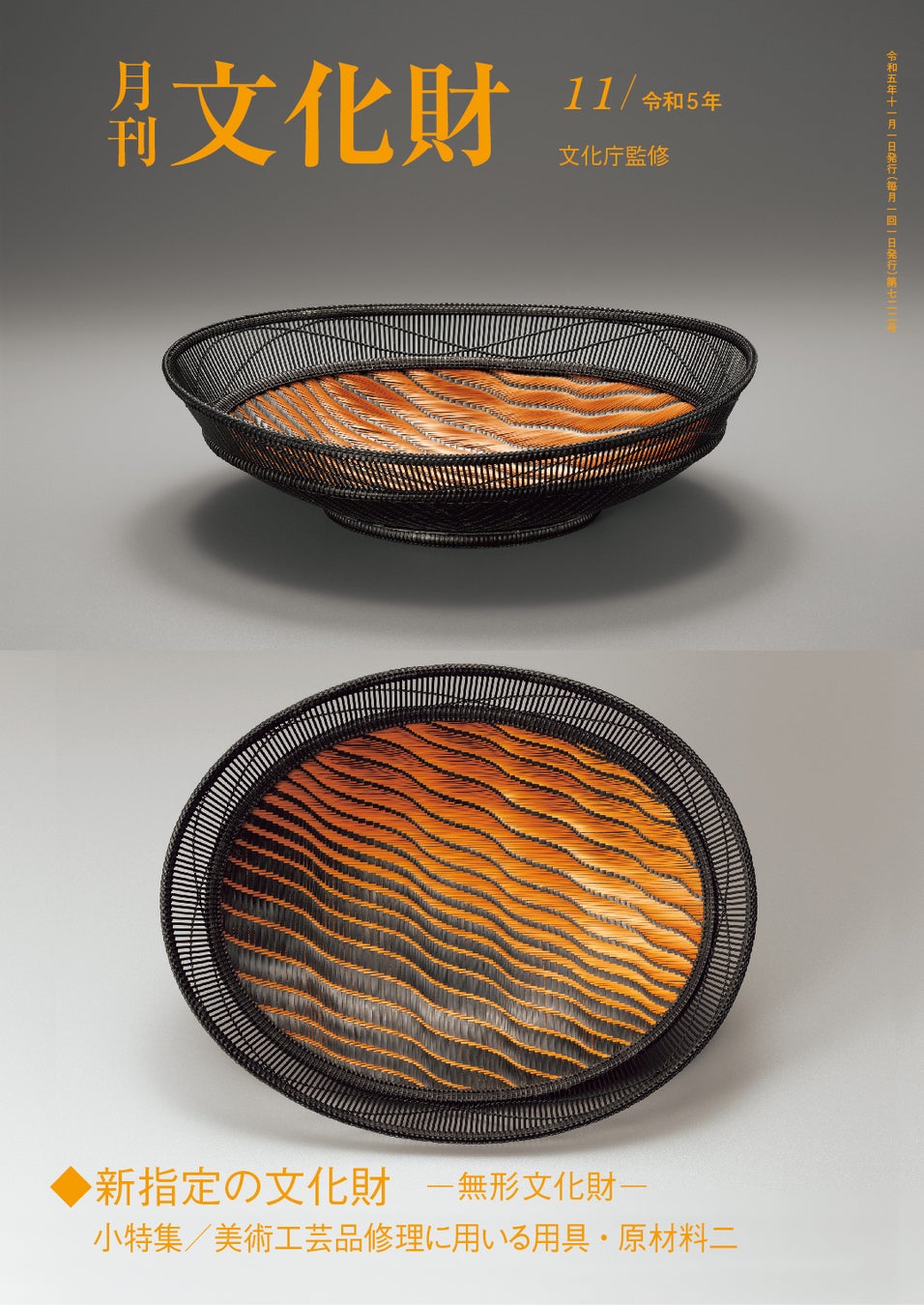 11月号では、能ワキ方、宮薗節三味線、古典落語などの新指定の文化財(無形文化財)、手織中継表製作、能装束製作などの選定保存技術の選定・認定を特集しています。