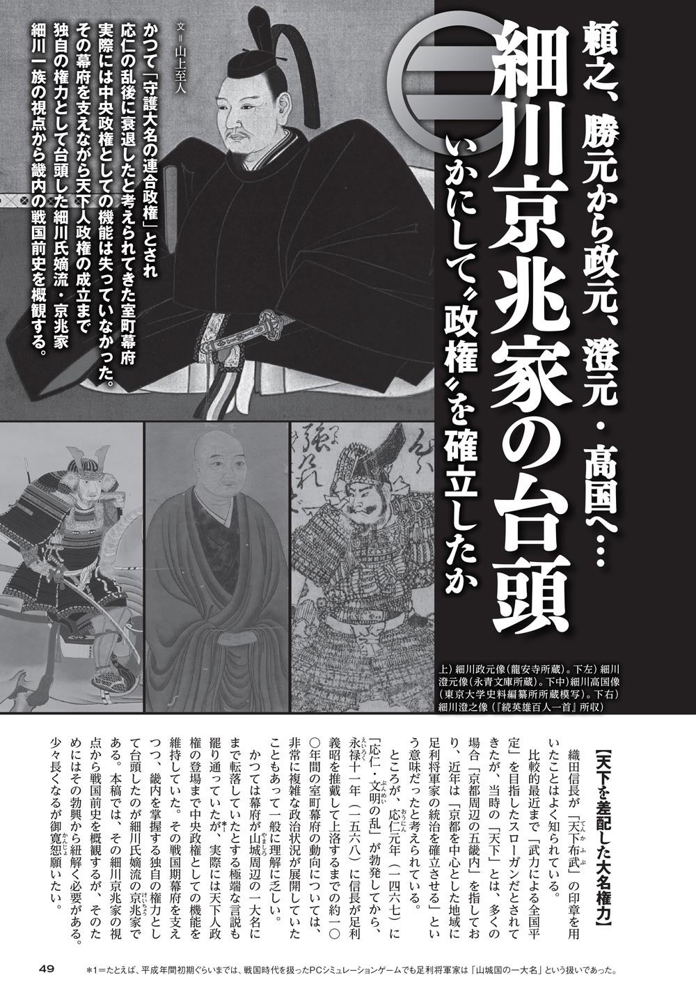 第二特集「細川京兆家の台頭~いかにして政権を確立したか」では、室町幕府において細川京兆家がいかにして強い力を持つにいたったかを、その始祖・頼之の代から応仁の乱の時の当主・勝元、その子・政元、そして澄元、高国の時代までを追いながら考察します。