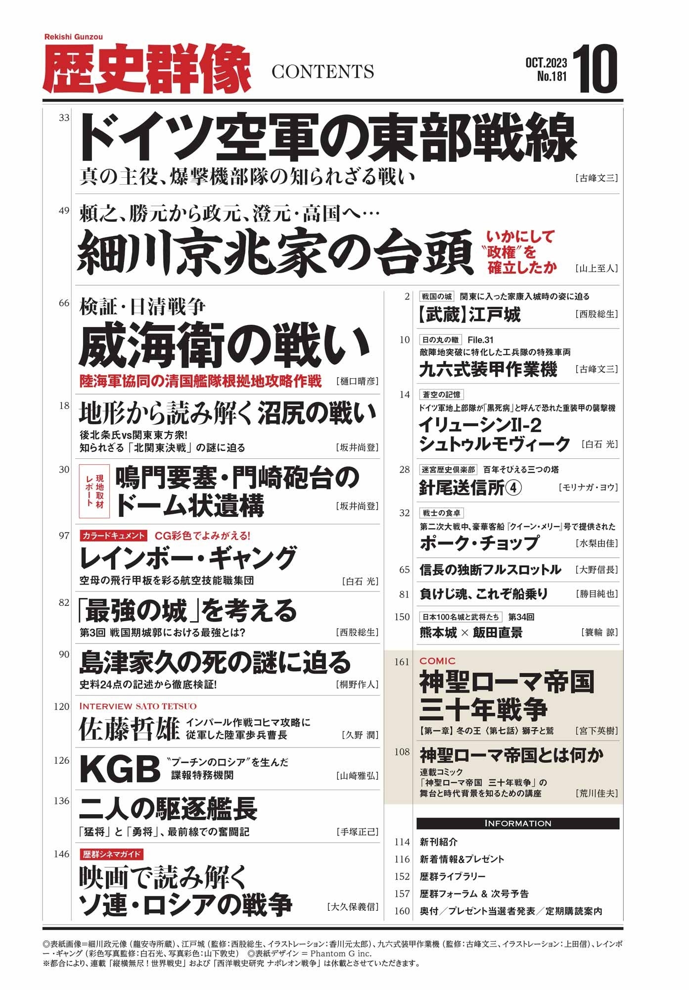 このほか、第三特集「検証・日清戦争 威海衛の戦い」以下、「イラスト再現 武蔵・江戸城~関東に入った家康入城時の姿に迫る!」「CG彩色でよみがえる!レインボー・ギャング」「地形から読み解く 沼尻の戦い」「島津家久の死の謎に迫る」「KGB~“プーチンのロシア”を生んだ諜報特務機関」「二人の駆逐艦長」など、読み応え満点の魅力あふれる記事多数掲載、充実の内容となっています。