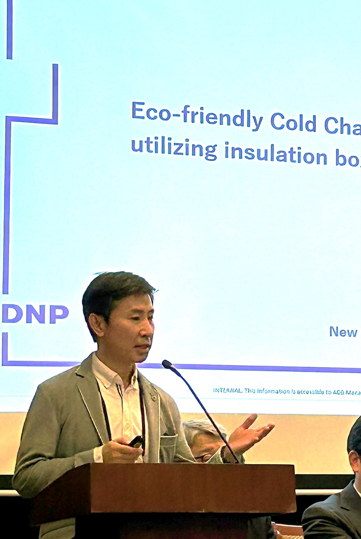 この取り組みは、電源無しで内部の温度を長時間一定に保つ「DNP多機能断熱ボックス」*2とDNPが開発したデジタル配送管理システム*3を活用し、フィリピンの低温度帯配送「コールドチェーン」市場に新たな選択肢の提供を目指すものです。冷蔵車不足や都心部の渋滞等の課題があるフィリピンにおける本ソリューションの受容性を検証しており、この取り組みを推進しているDNPのモビリティ事業部の神戸博文が講演しました。