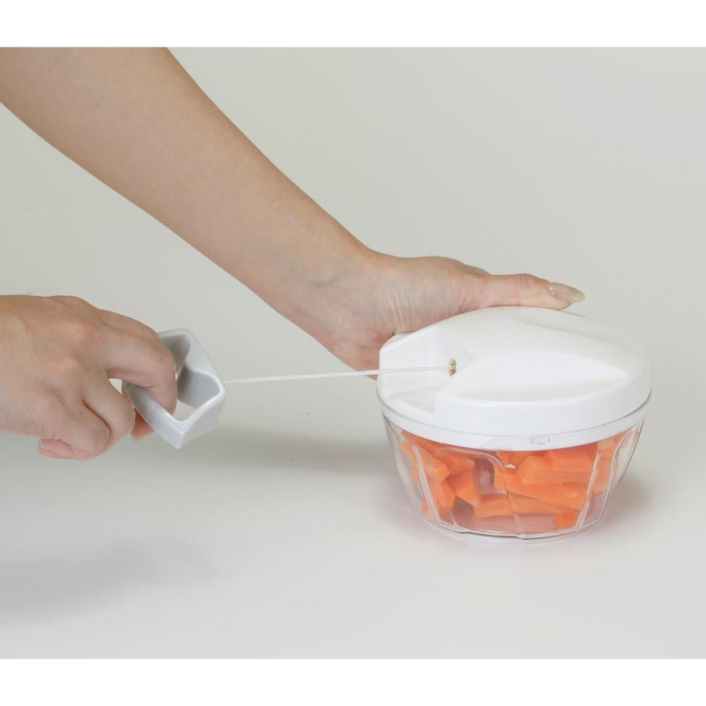 小さくカットした野菜を容器に入れて、ハンドルを繰り返し引っ張るだけで、簡単にみじん切りができる、時短調理アイテムです。