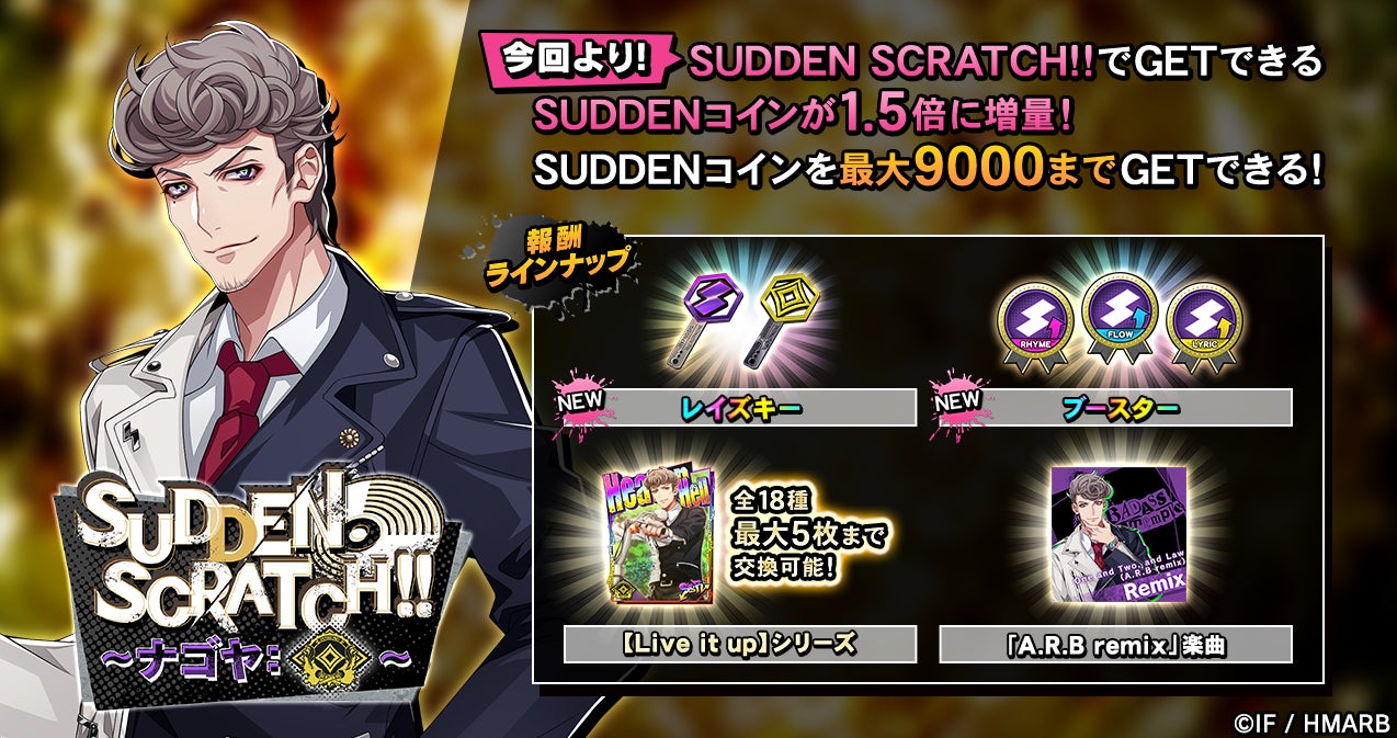 イベント期間中、KILLER SCRATCH!!をプレイするとライズ消費量に応じた確率でSUDDEN SCRATCH!!が発生します。SUDDEN SCRATCH!!をプレイすると、通常の報酬アイテムの他、限定アイテム「SUDDENコイン」を獲得することができます。「SUDDENコイン」を集めることで、レイズキーやナゴヤ・ディビジョンのデコステッカーに使えるブースターなどと交換することが可能です。他にも、ストーリーカードの【Live it up】シリーズ、「A.R.B remix」楽曲などがラインナップされています。詳細はアプリ内お知らせをご確認ください。
