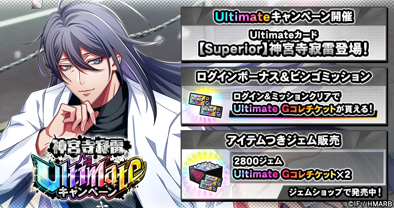 Ultimateカード「SSR【Superior】神宮寺寂雷」を獲得することができるGコレクトや、ビンゴミッション・ログインボーナスを開催しています。