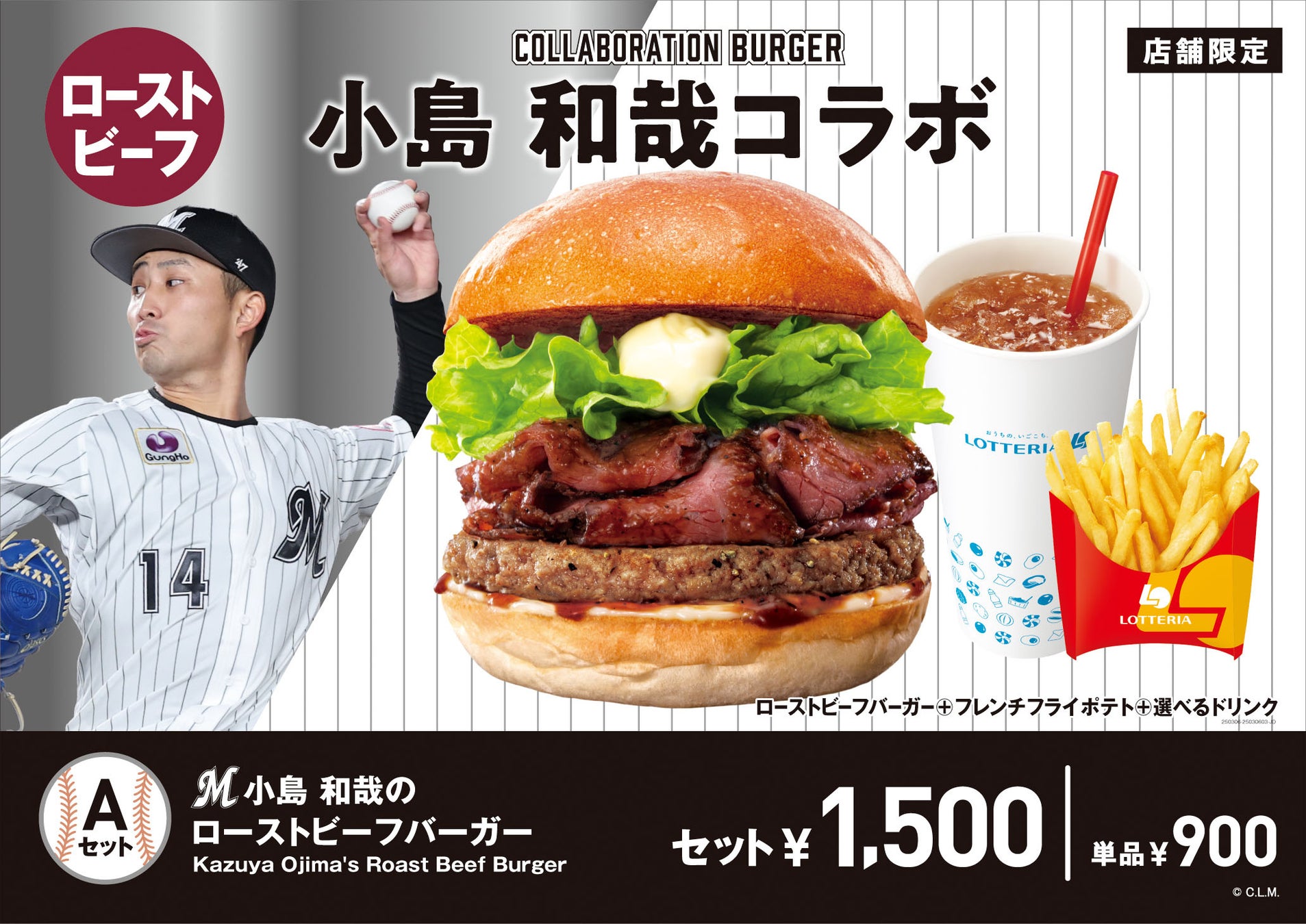 商品概要:昨年ご好評いただいた小島 和哉選手とのコラボバーガーが今年も登場です。醤油ベースのオリジナルソースを合わせたローストビーフを、牛肉100%パティやレタス、マヨネーズとともにふんわりもっちり食感のバンズで挟みました。